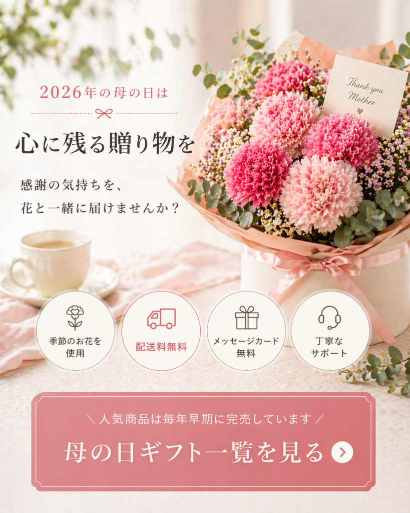 2026年の母の日も、花を中心に、スイーツやメッセージなどを組み合わせることで、より印象に残る贈り物になります。