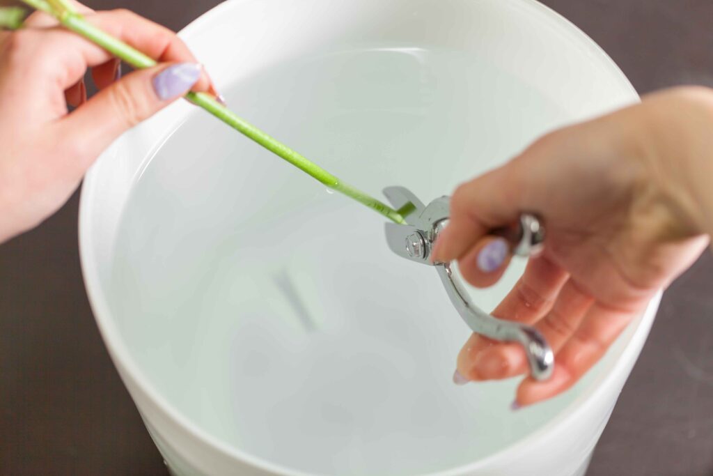 なるべく早くラッピングを外して花ばさみを使って 水切り(水を張ったバケツの中で茎を切ること)をします。