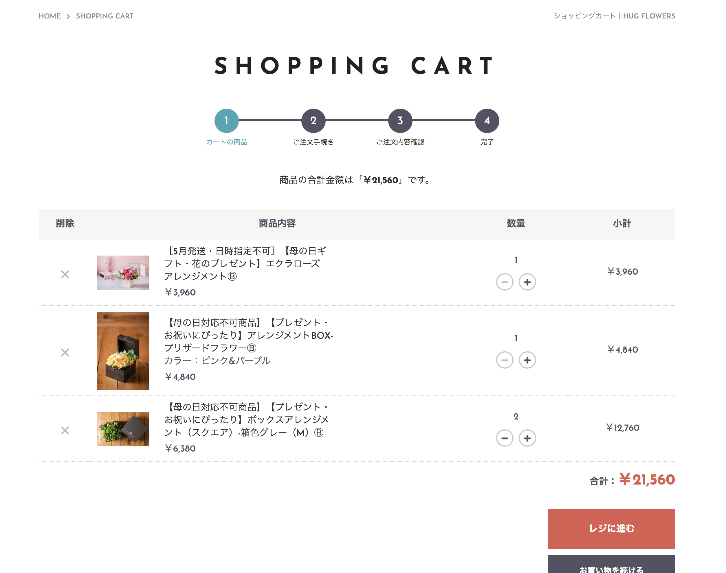 カートでの商品削除方法 NEWS HOMENEWSカートでの商品削除方法 2021.04.29 お知らせ カートでの商品削除方法 カート内で商品の削除を行う方法です。 ①「カートの商品」ページの該当商品サムネイルの左にある×をタップ。 ②「ご注文手続き」ページ、③「ご注文内容確認」ページでは変更できませんので前ページの①「カートの商品」ページへ戻って変更お願いいたします。 ※↓ご注文手続きページ以降では修正できませんのでご注意ください。↓ テーマ: タグ01 一覧へ戻る CATEGORY 商品について お知らせ ARCHIVES 2025 2024 2023 2022 2021 テーマを表示 タグ01
