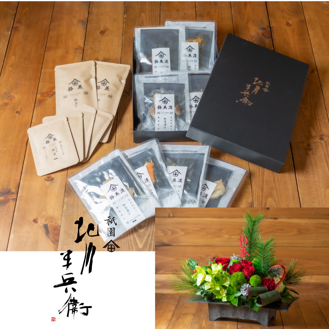 (お茶漬け8食+極上宇治茶2種+専用抹茶4食分)&迎春アレンジメントのセット松