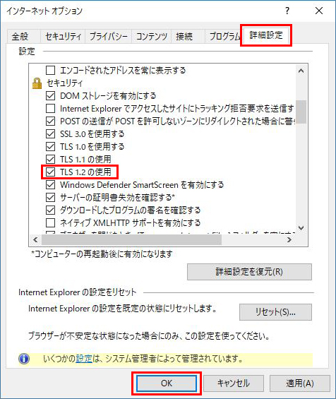 ・ブラウザの設定等により、TLS1.2の設定をオフにしている場合