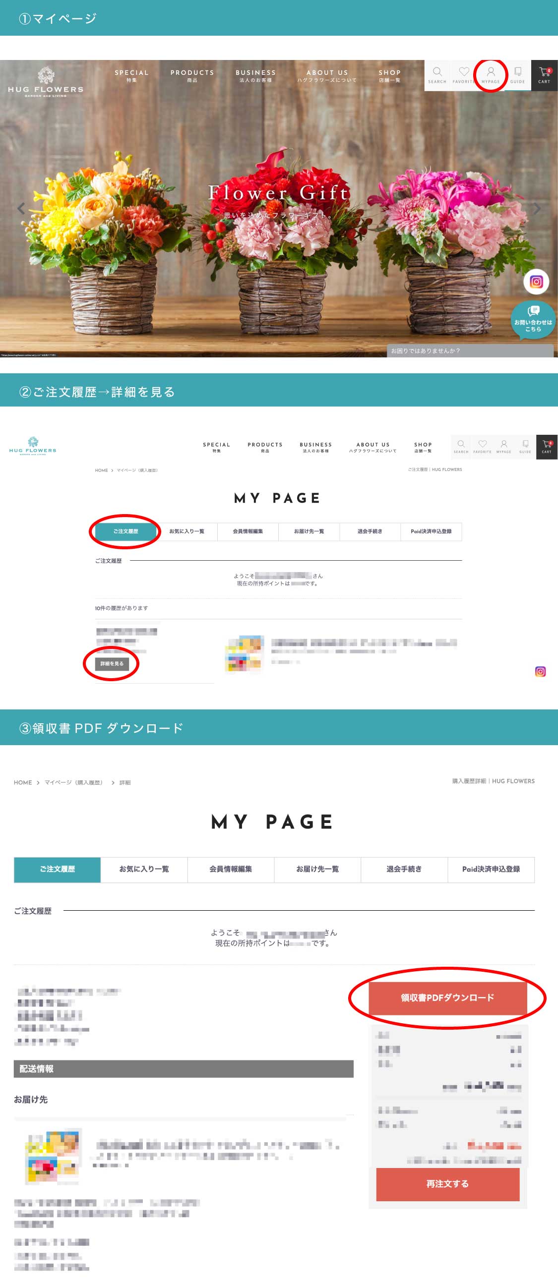 HUG FLOWERSでは、インボイス制度に対応した領収書(PDF形式)をマイページより発行いただけます。