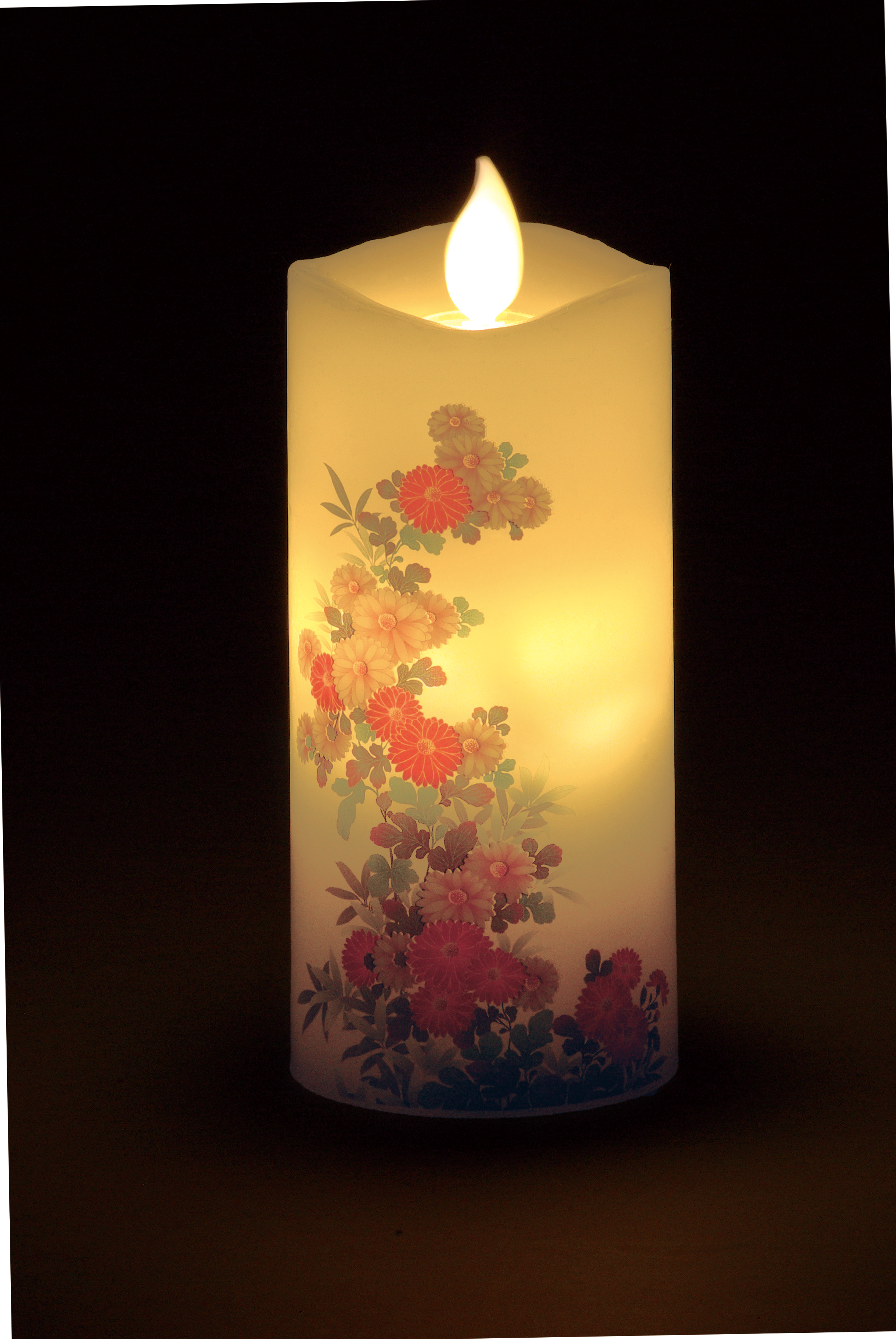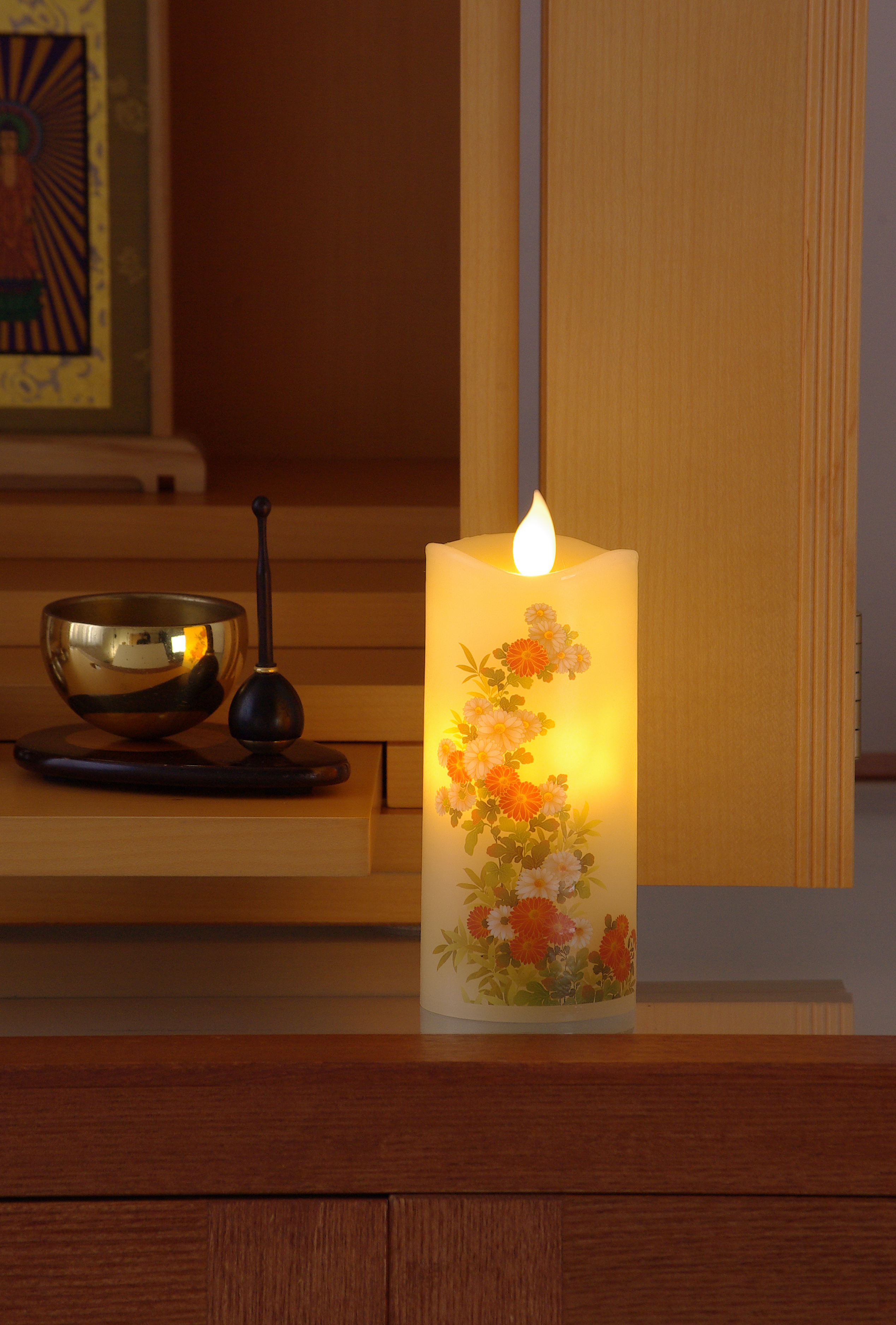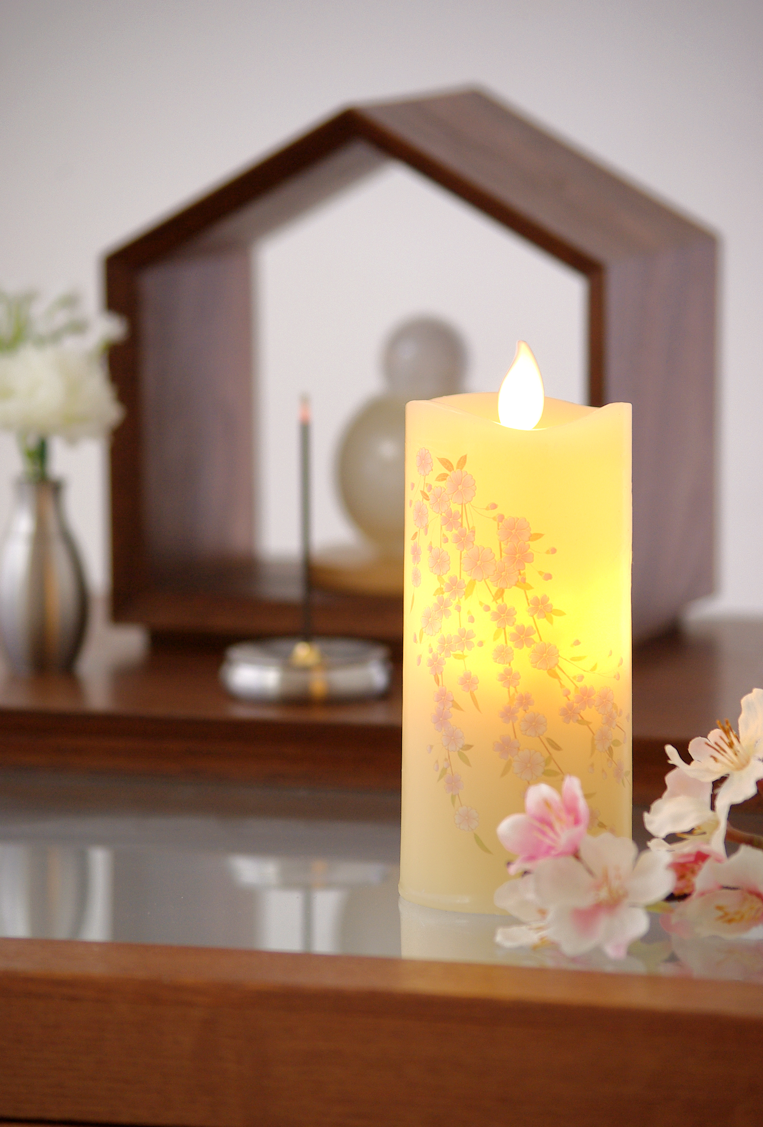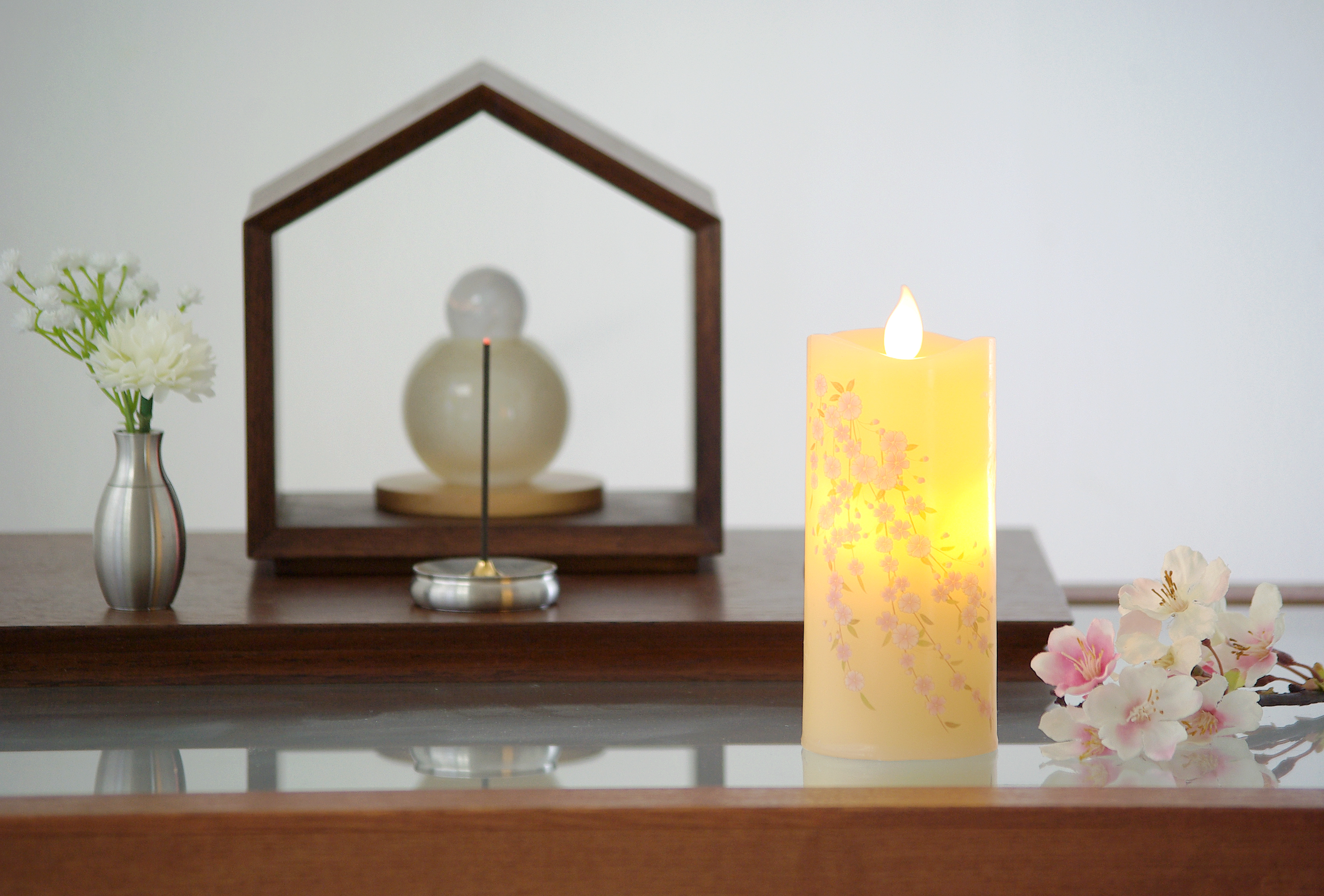 やさしい灯りで祈りの空間を彩る、LEDローソク『いろはあかりS』と、白×グリーンのアレンジメントのセットです。LEDローソクはコンパクトなサイズで、小さめのお仏壇にもすっきり収まります。本体全体がふんわりと光り、炎のようにゆらゆらと揺れる灯りは、まるで本物のロウソクのようなやさしさ。火を使わないため、消し忘れの心配もなく安心してご使用いただけます。付属のリモコンには便利なタイマー機能付き。「毎日決まった時間に点灯し、6時間後に自動消灯」の設定も可能で、日々の祈りの時間を自然に習慣化できます。