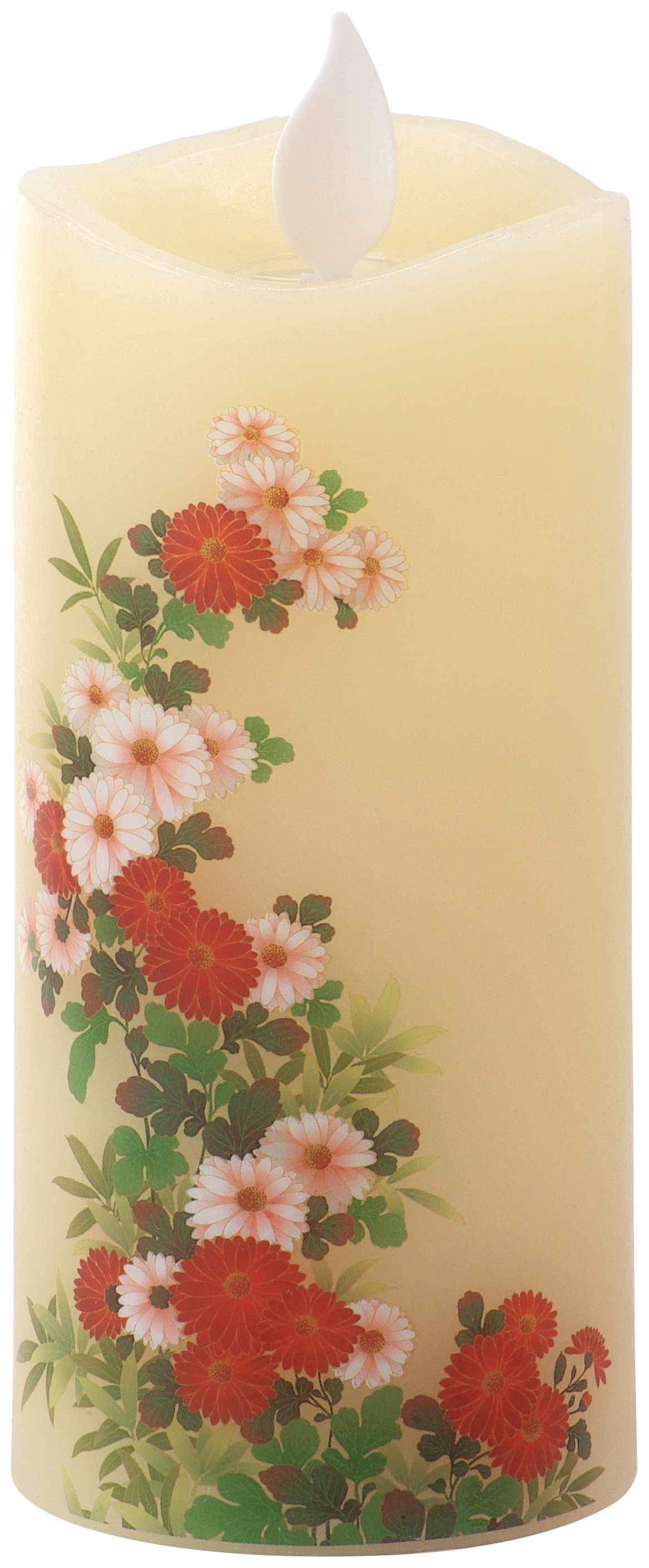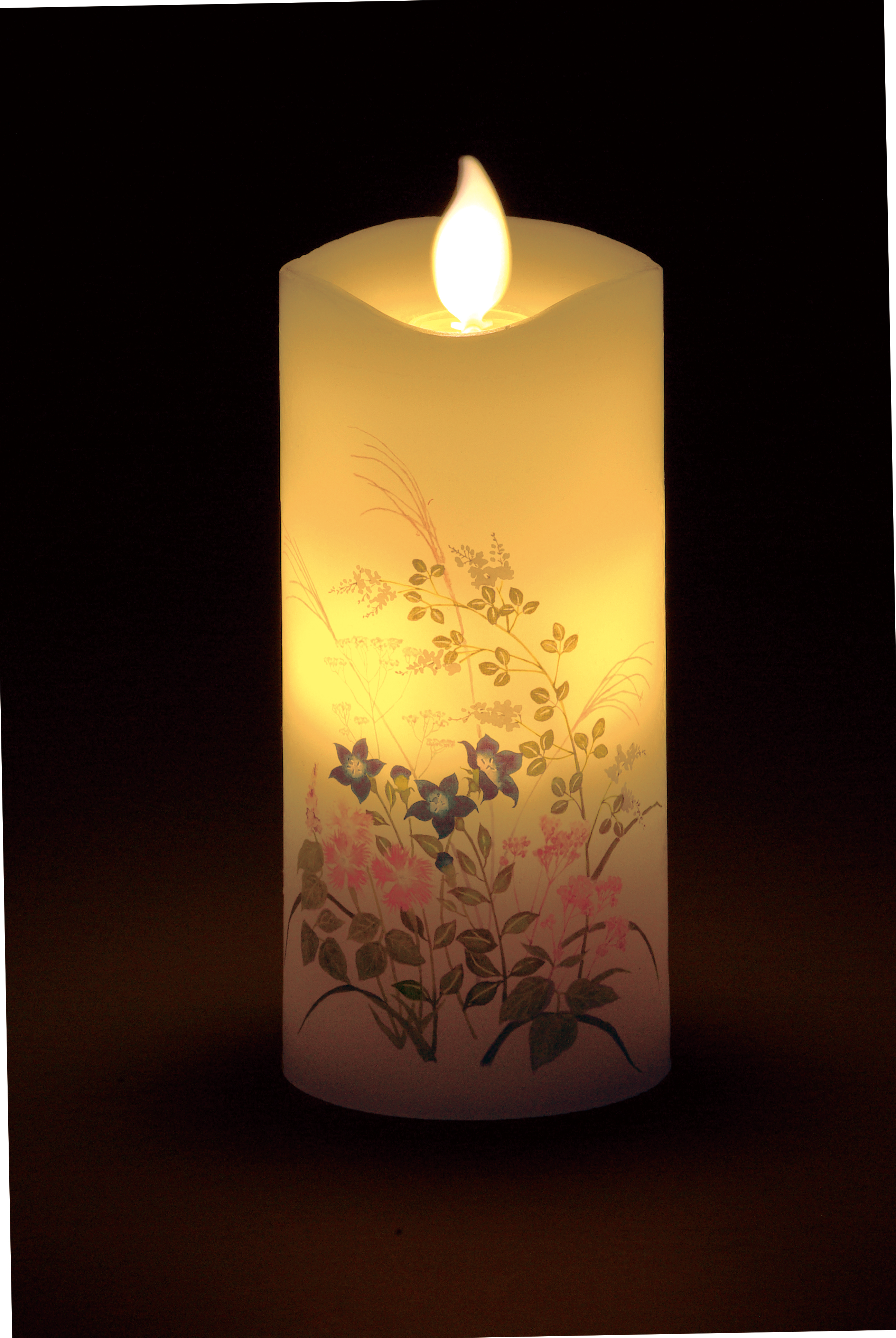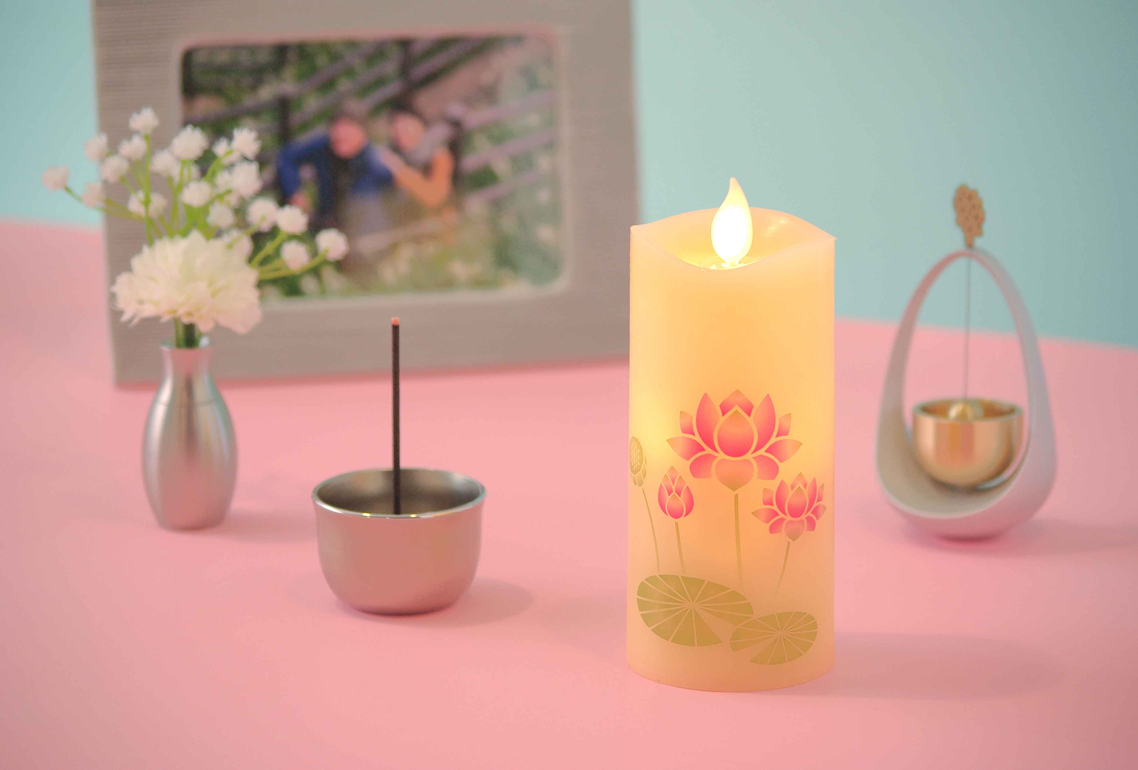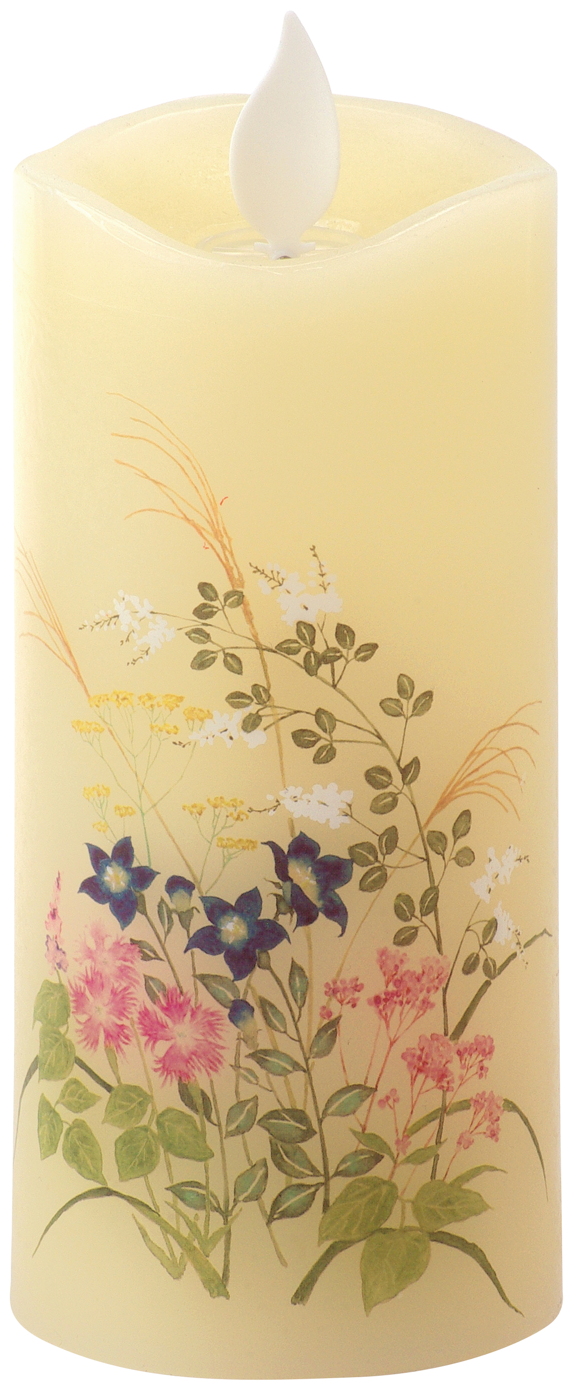 やさしい灯りで祈りの空間を彩る、LEDローソク『いろはあかりS』と、白×グリーンのアレンジメントのセットです。LEDローソクはコンパクトなサイズで、小さめのお仏壇にもすっきり収まります。本体全体がふんわりと光り、炎のようにゆらゆらと揺れる灯りは、まるで本物のロウソクのようなやさしさ。火を使わないため、消し忘れの心配もなく安心してご使用いただけます。付属のリモコンには便利なタイマー機能付き。「毎日決まった時間に点灯し、6時間後に自動消灯」の設定も可能で、日々の祈りの時間を自然に習慣化できます。