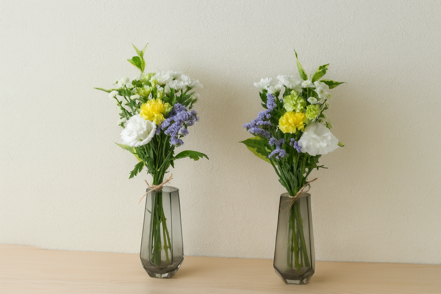 法要や命日にふさわしい上品な仕立て。対で揃えられ、改まった供花に安心して利用できる仕様。命日・法要の仏前に。