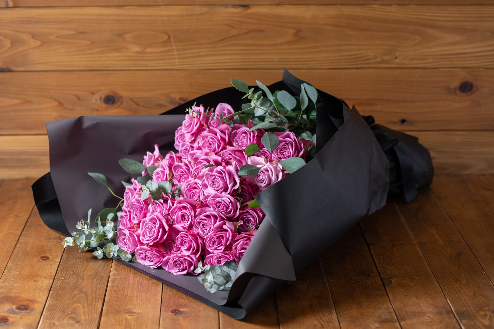 ミュートトーンのローズをふんだんに使った、上品で落ち着きのある大本数ブーケです。派手すぎないカラーリングで、大人の記念日ギフトやプロポーズにもよく選ばれています。ボリューム感とやさしい色合いを両立した、ワンランク上のフラワーギフトです。