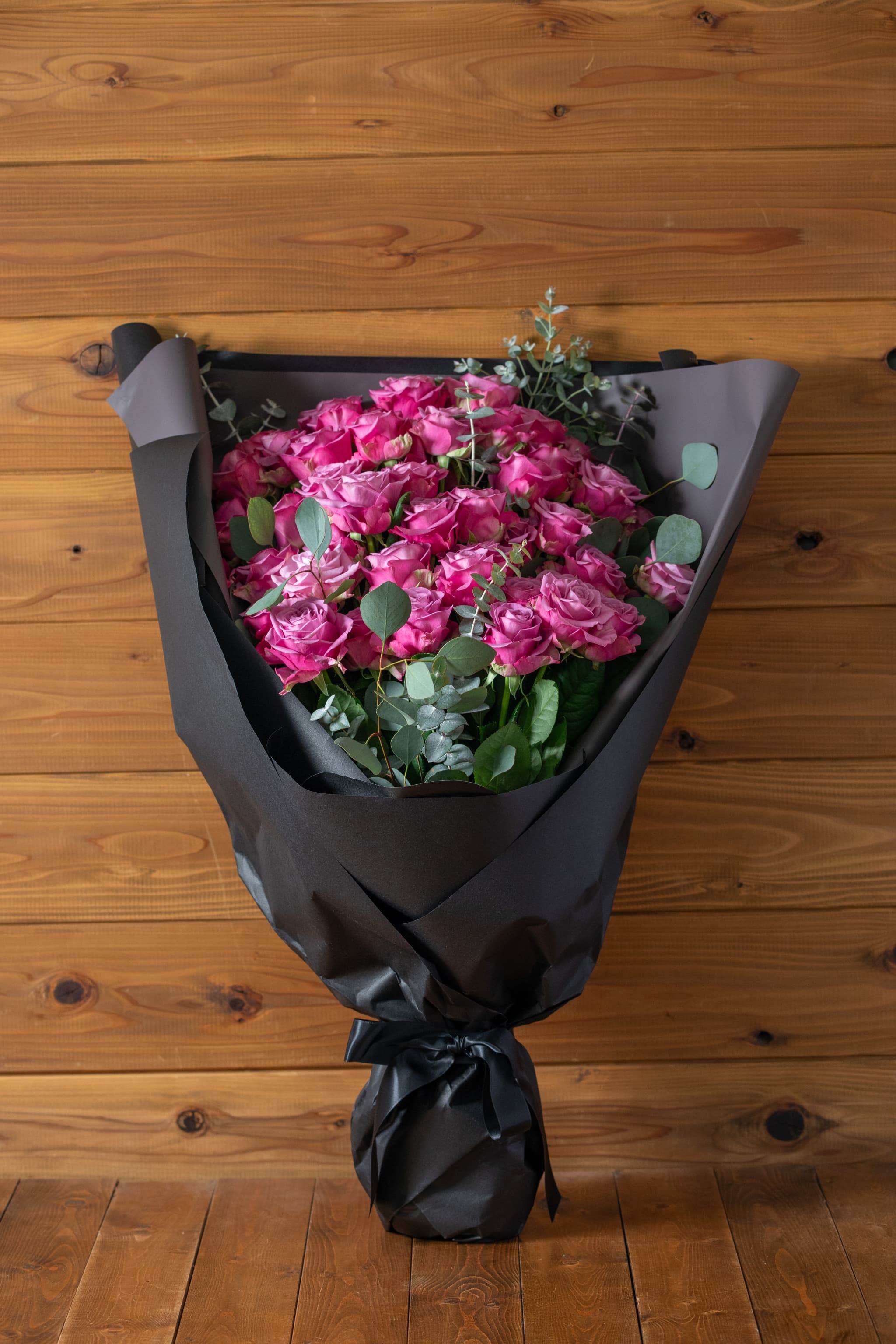 ミュートトーンのローズをふんだんに使った、上品で落ち着きのある大本数ブーケです。派手すぎないカラーリングで、大人の記念日ギフトやプロポーズにもよく選ばれています。ボリューム感とやさしい色合いを両立した、ワンランク上のフラワーギフトです。
