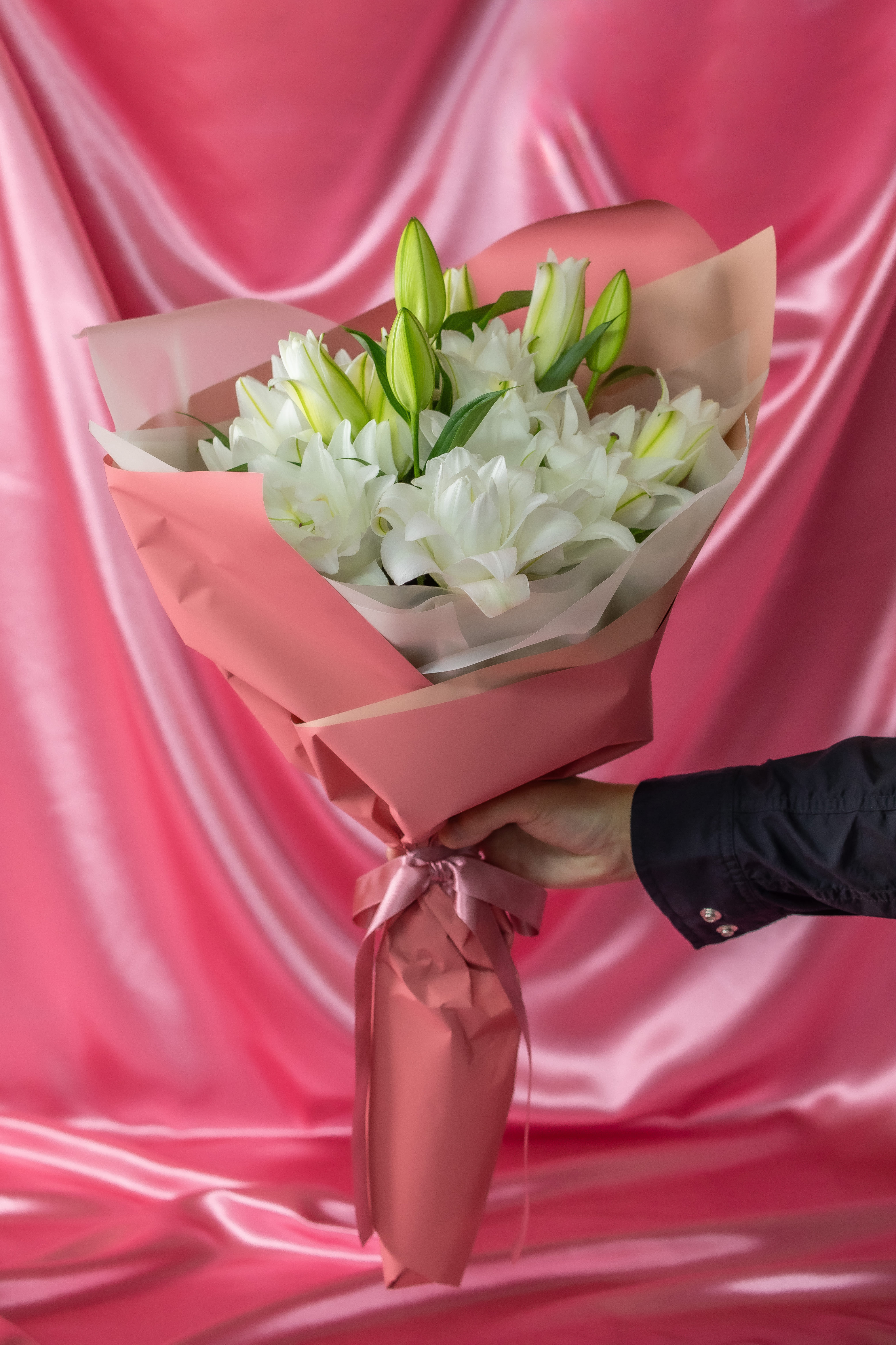 上品なユリを使用した大人向けのブーケ。落ち着いた雰囲気で、特別感のある贈り物としておすすめです。