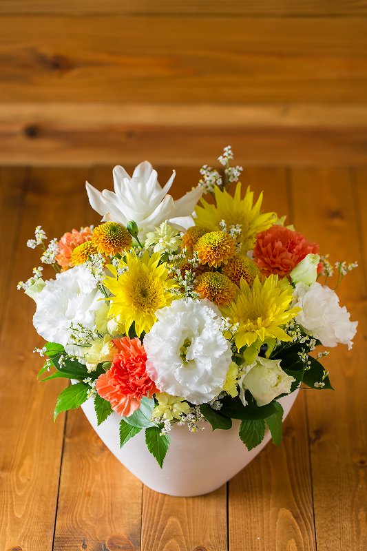 アレンジメント(イエロー系) 暖色のお花をふんだんに使ったアレンジメントフラワー。