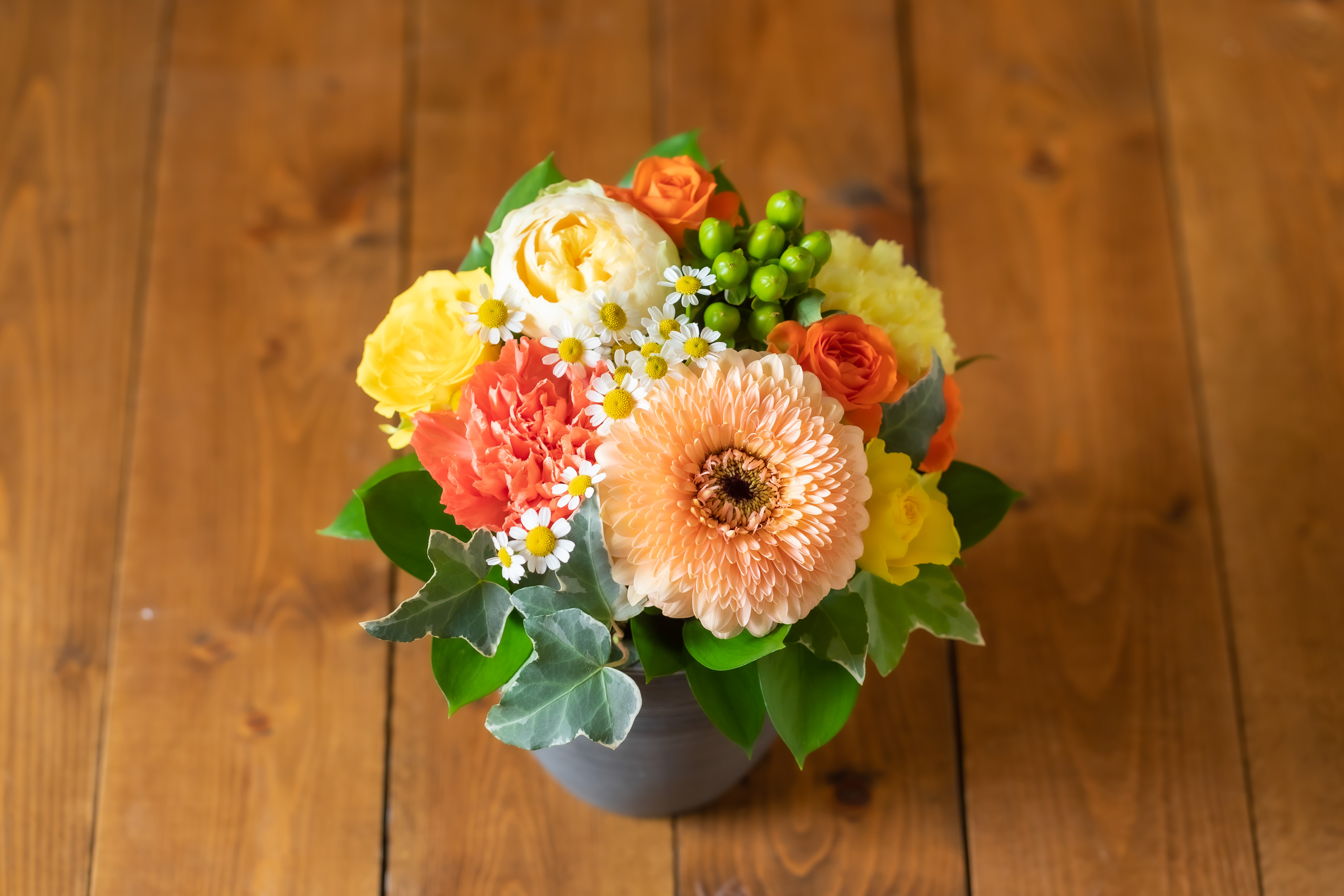 【プレゼント・お祝いにぴったり】アレンジメントフラワー/アプリコットオレンジ|HUG FLOWERS