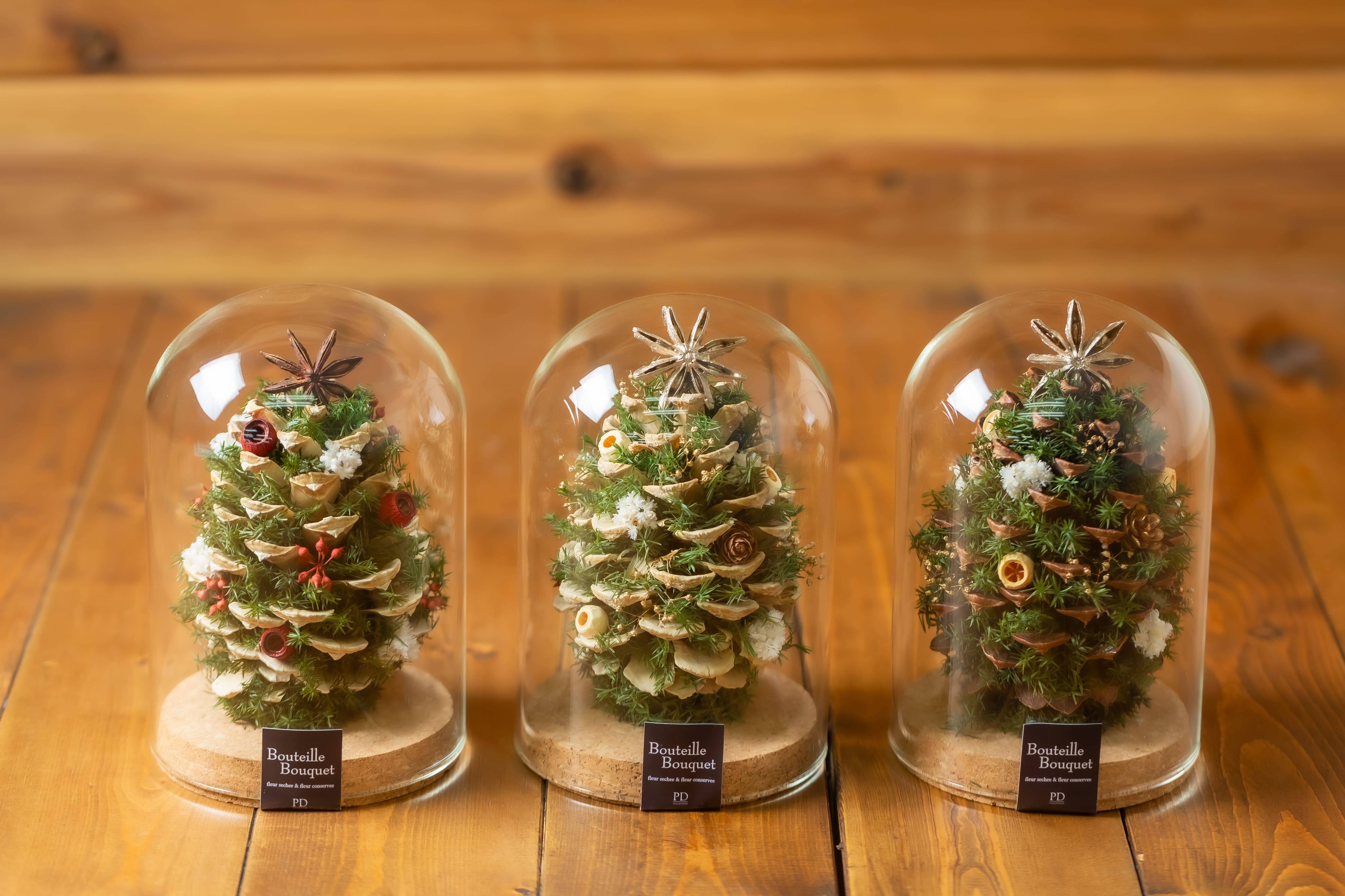 ドーム型のコルクグラスに入った、ミニサイズのクリスマスツリーです。