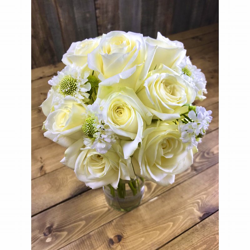 白ウエディングドレスにぴったりのスタンダードなクラッチドブーケ、純白のブーケは柔らかい印象を与えてくれます。
