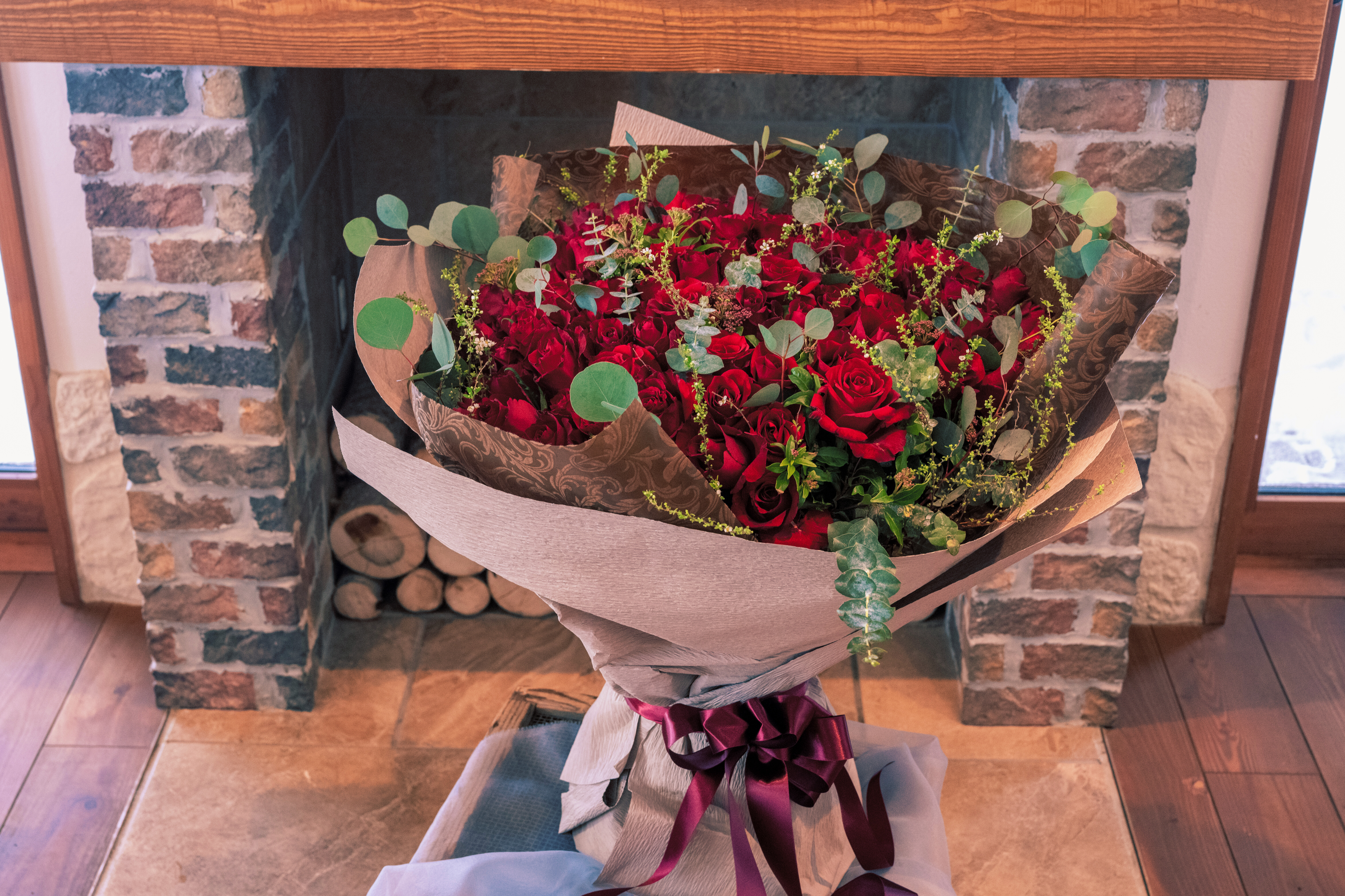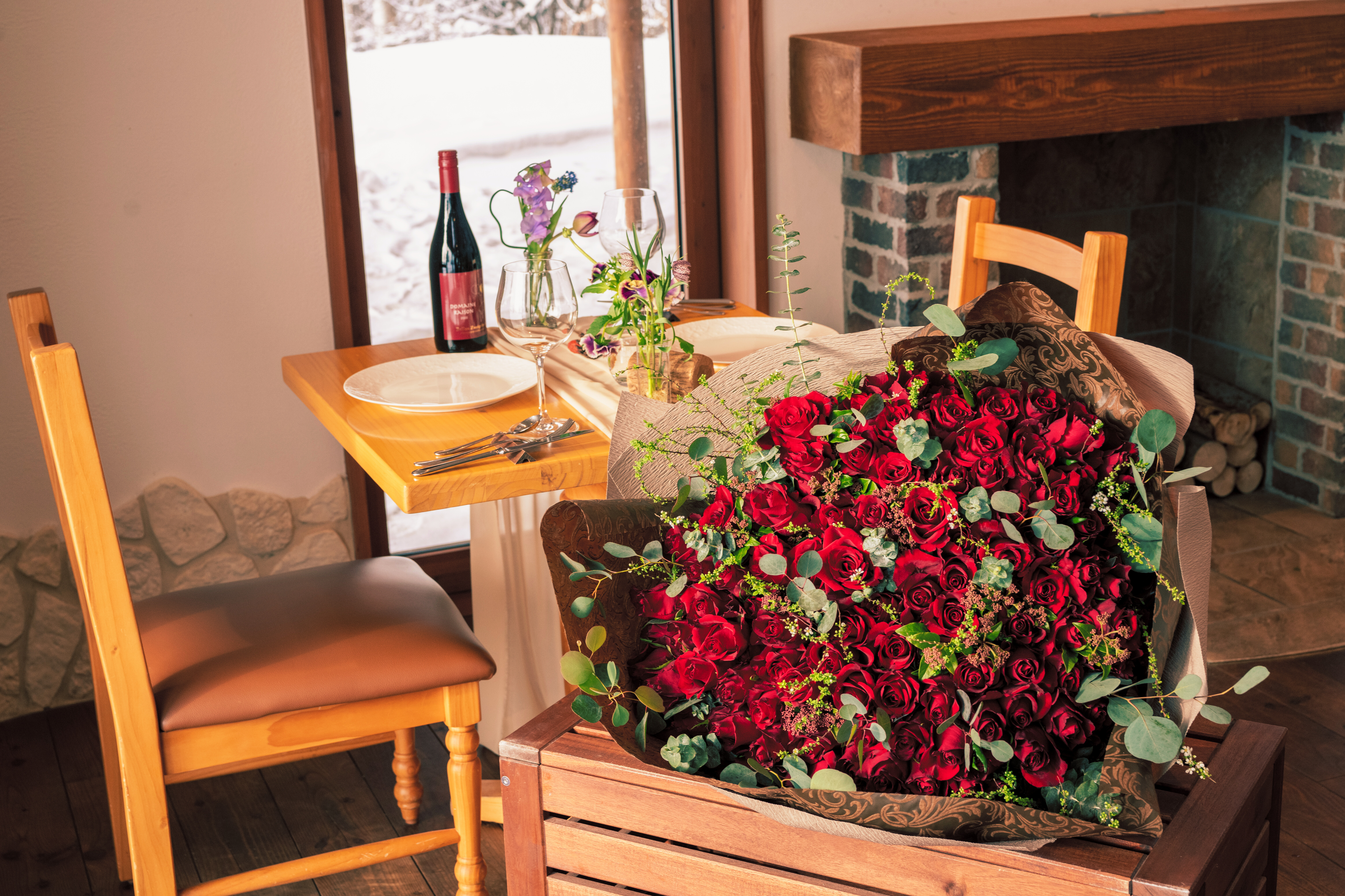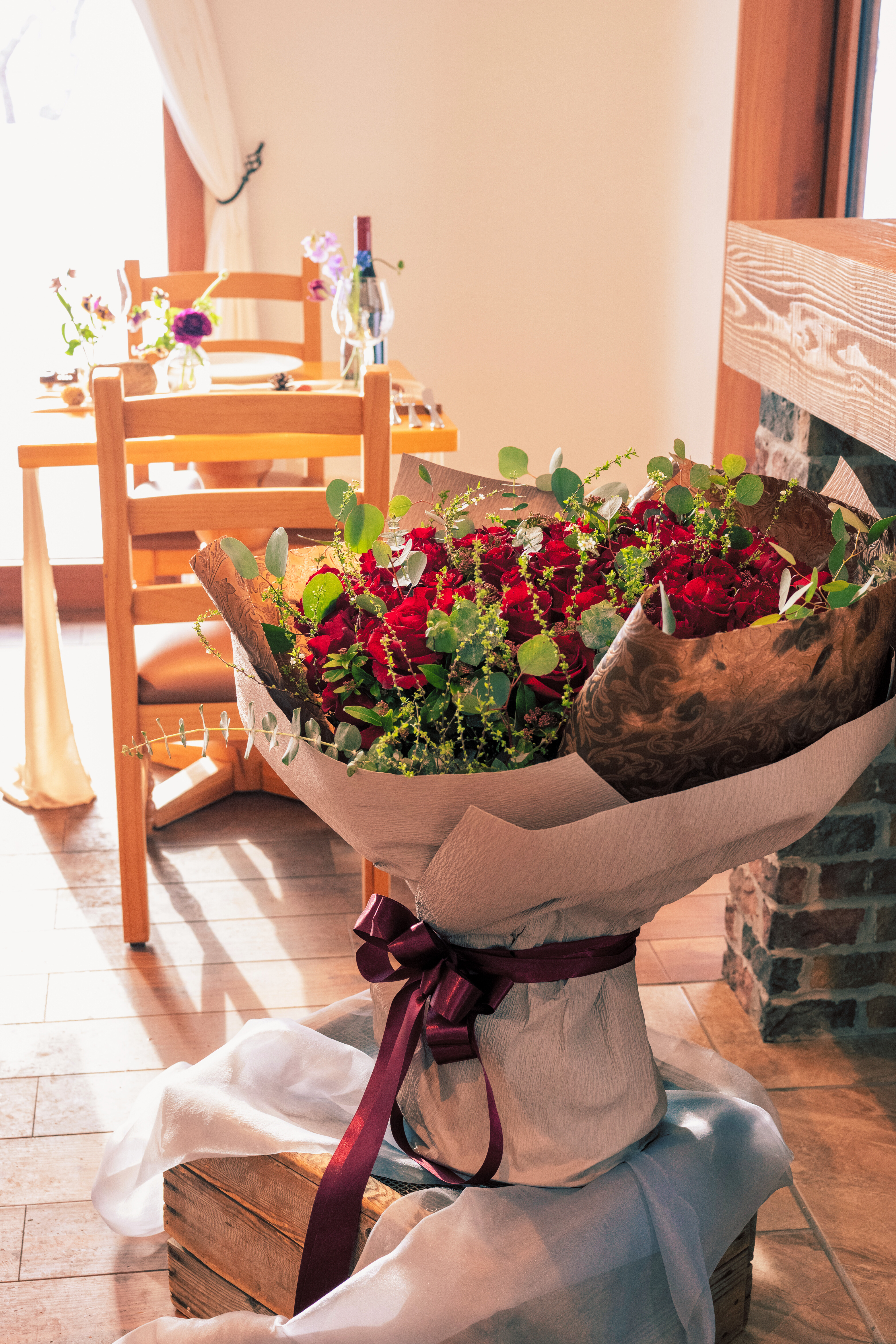 真っ赤なバラ108本のブーケ。花言葉は「結婚して下さい」。