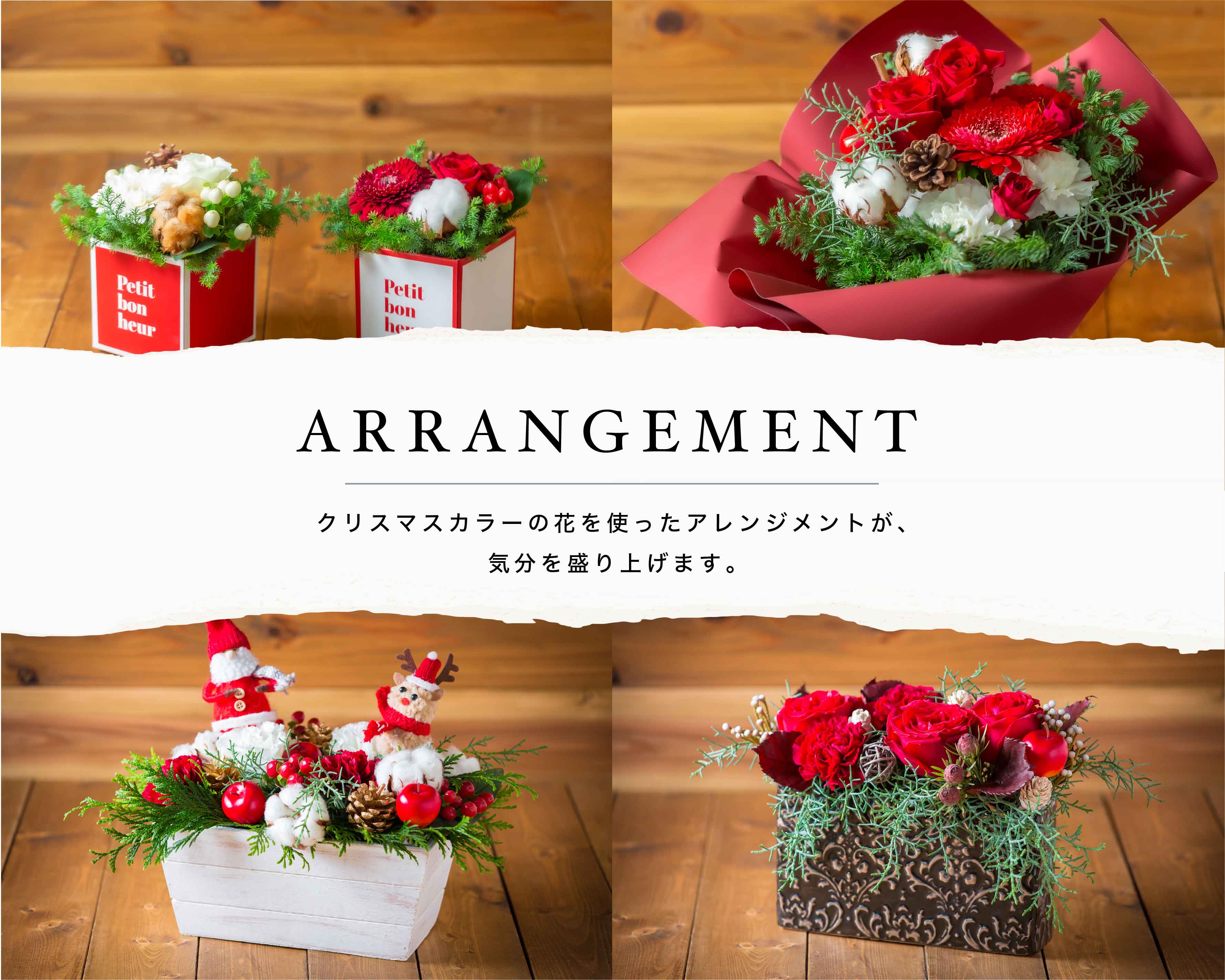 クリスマスカラーの花を使ったアレンジメントが、気分を盛り上げます。