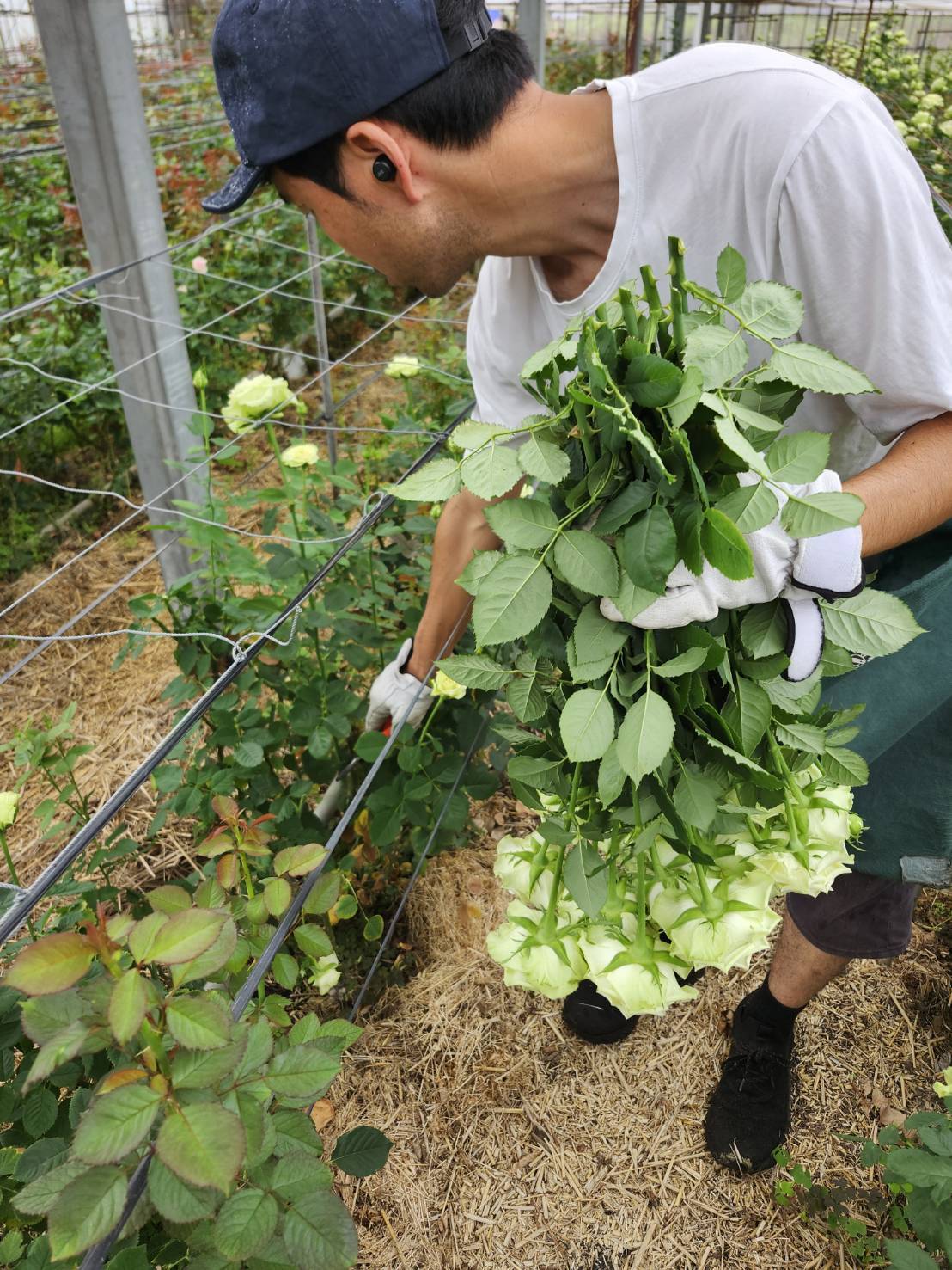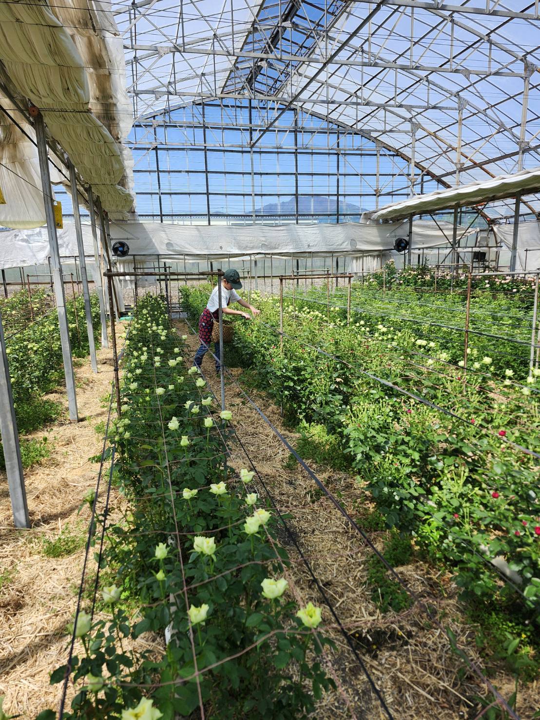 バラの出荷時には、バラが最高の状態でお客様に届くよう、品種ごとに最適な咲き具合で収穫し、品質保持剤入りの水バケツを使って輸送しています。特に半開きの状態で出荷されたバラは長持ちし、受け取った方々がその美しさを長く楽しむことができます。