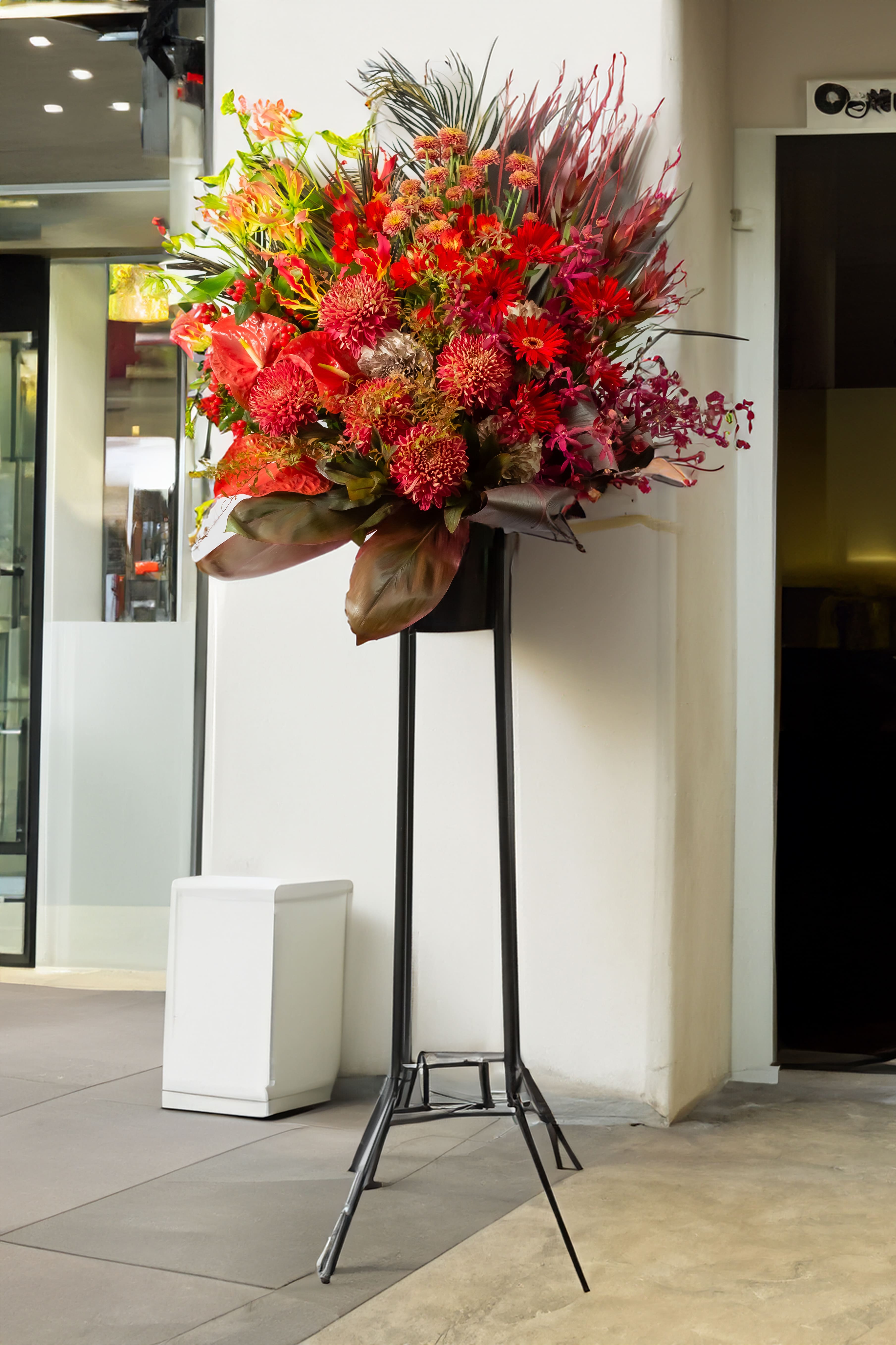 東京都内に新しくオープンしたカフェの開店祝いに、華やかなフラワースタンドをお届けしました。季節の花をふんだんに使用し、赤とピンクを基調としたデザインで、カフェの外観をさらに引き立てる仕上がりに。