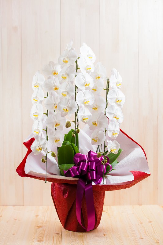定番の白い胡蝶蘭で、清潔感と高級感を兼ね備えたエレガントな印象。