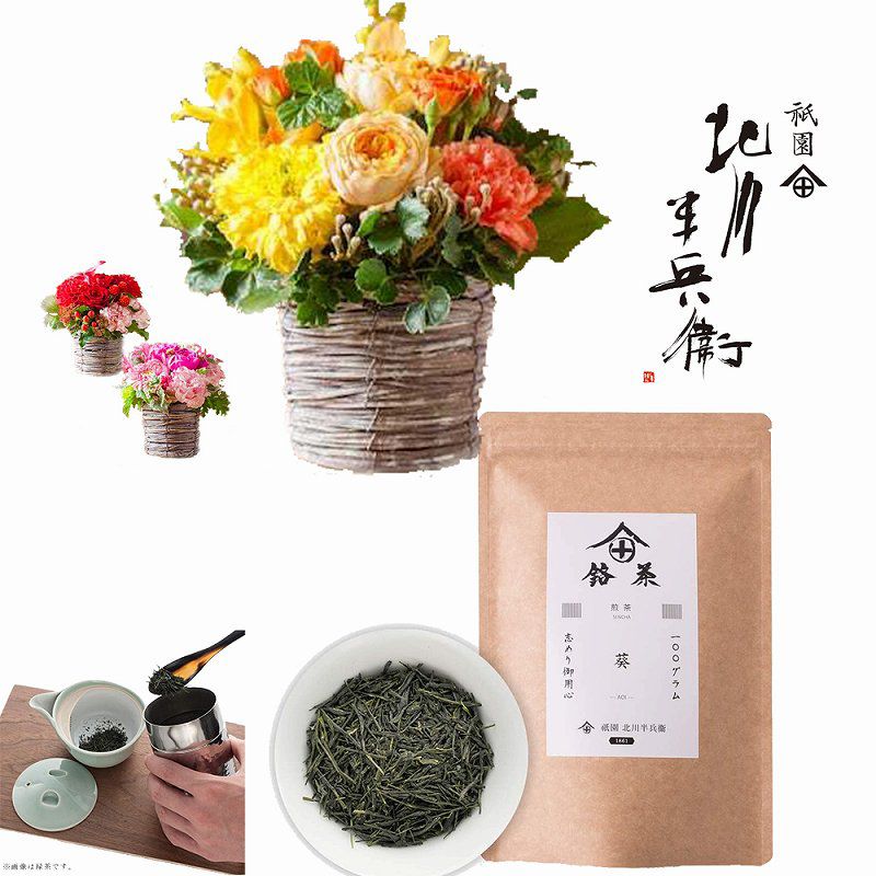アレンジメントフラワー(レッド)と祇園北川半兵衛のお茶【グリーンティー(常盤)】セットⒷ