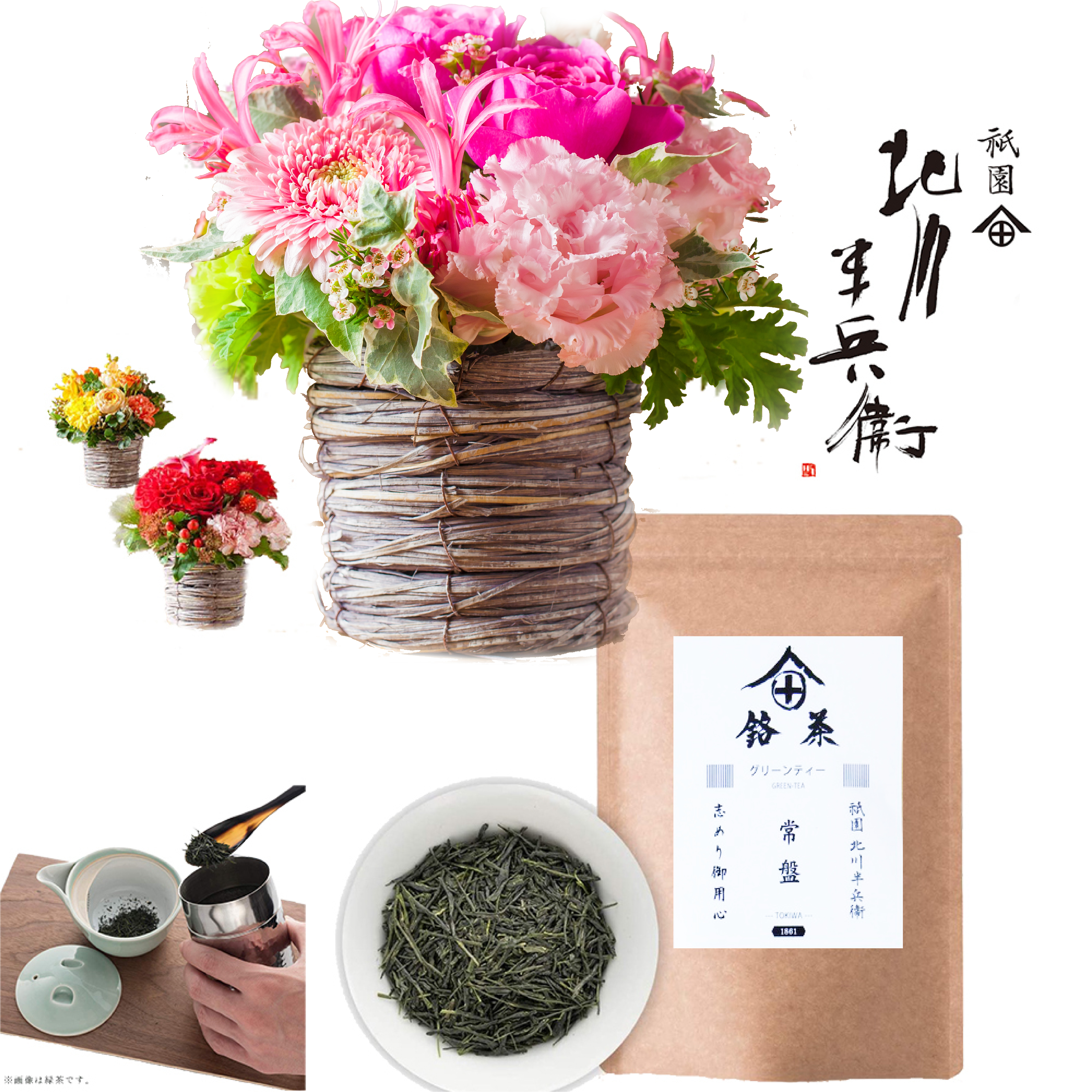 アレンジメントフラワー(ピンク)と祇園北川半兵衛のお茶【グリーンティー(常盤)】セットⒷ