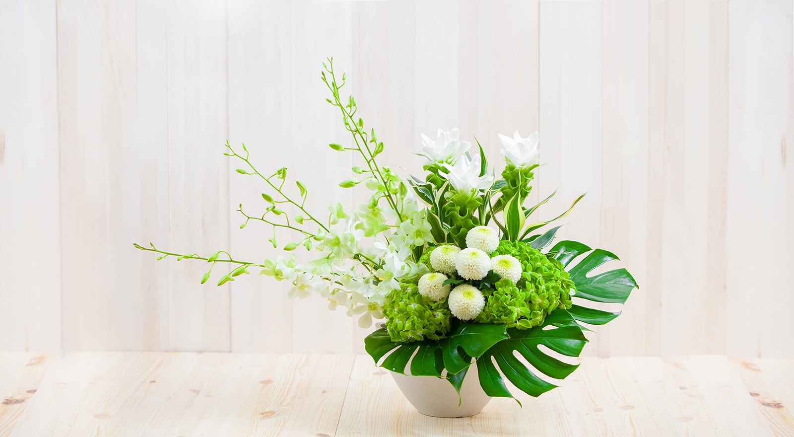 淡い緑やピンクの花を添えると、鮮やかすぎず明るく上品な印象に仕上がります。 -