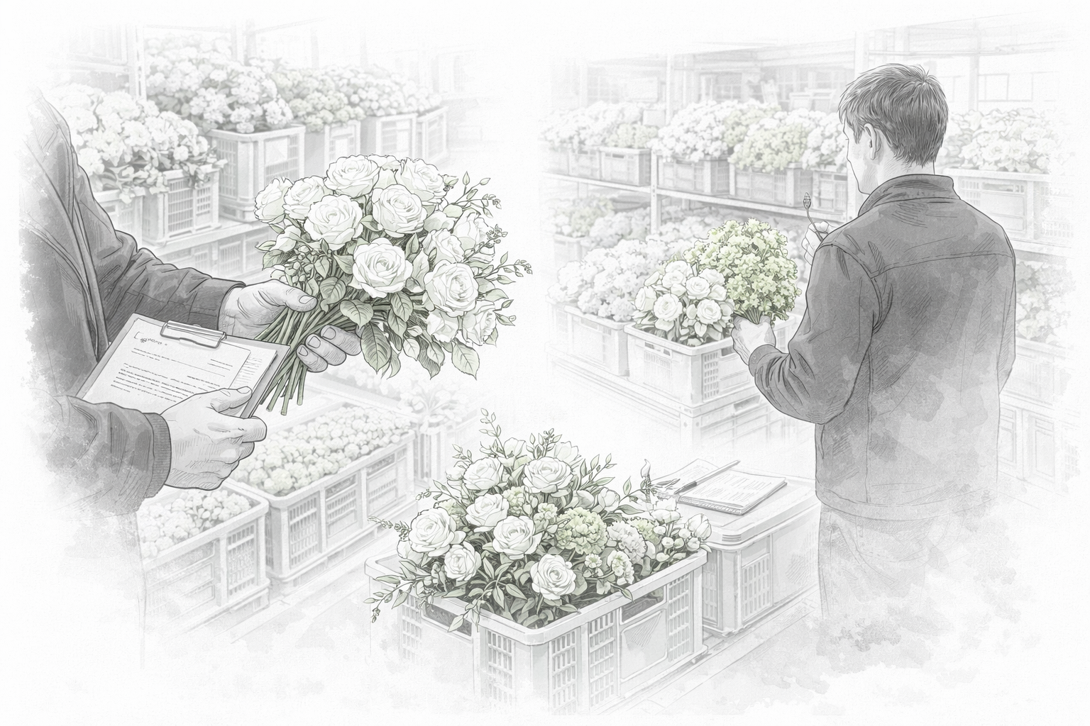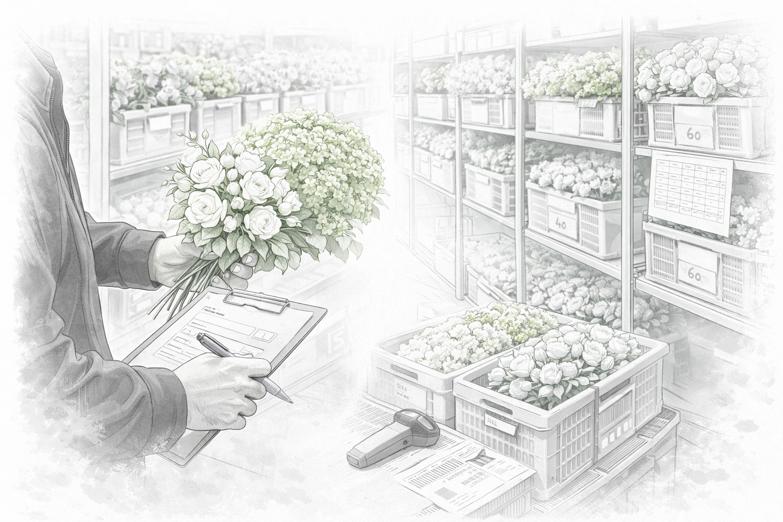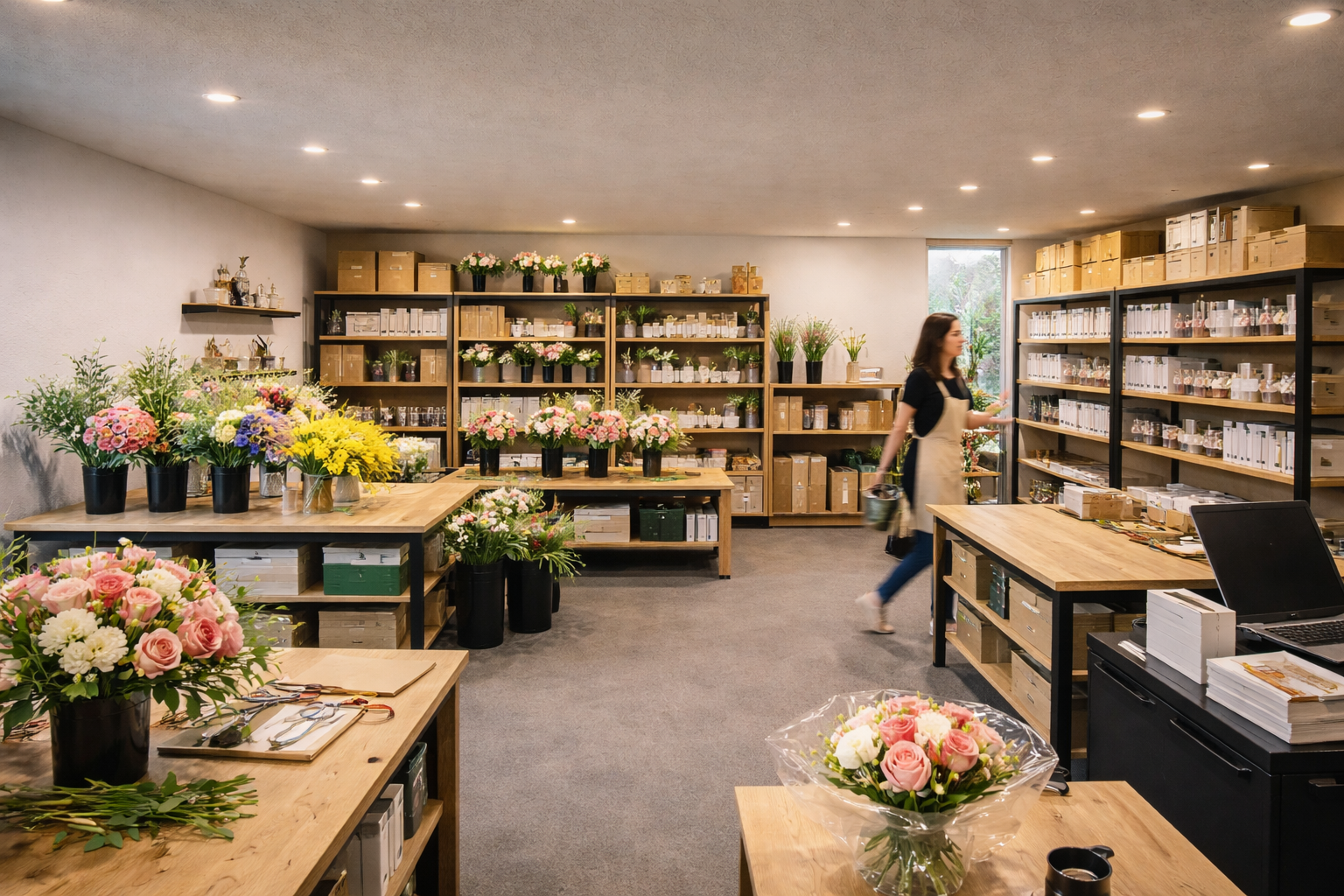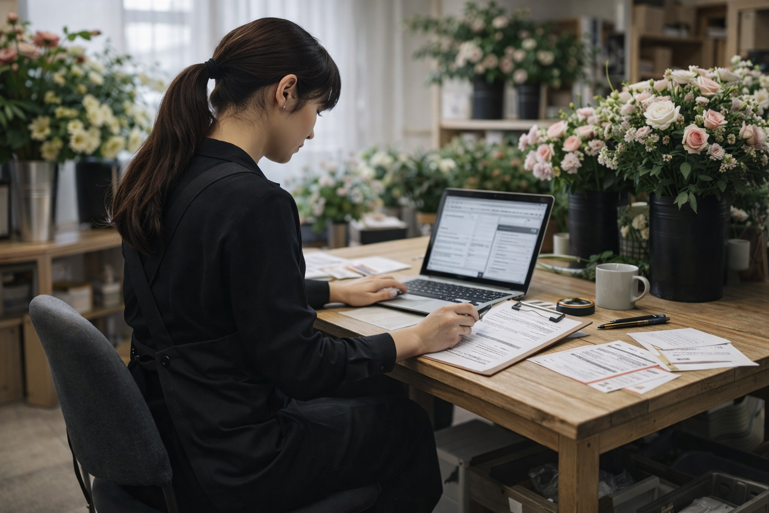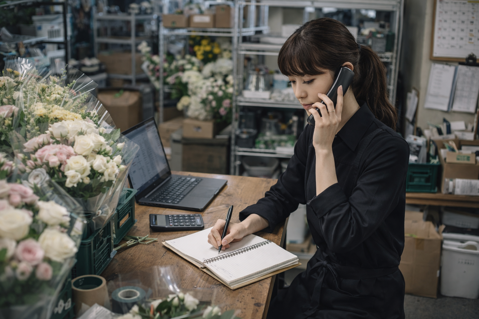 花材・資材の発注、必要数量の調整、繁忙期を見据えた準備など、商品制作の土台となる流れを支えます。