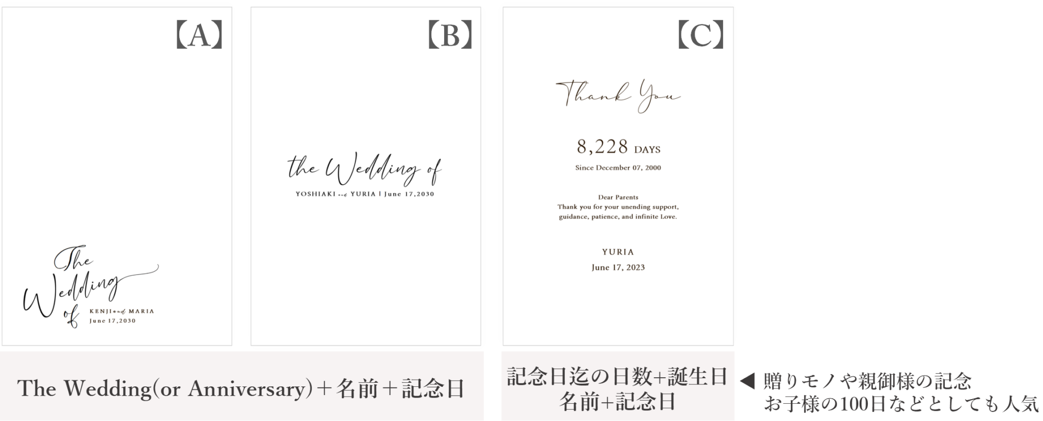 挙式で直筆サインしたり、フォトやパーティの記念として残すもよし。